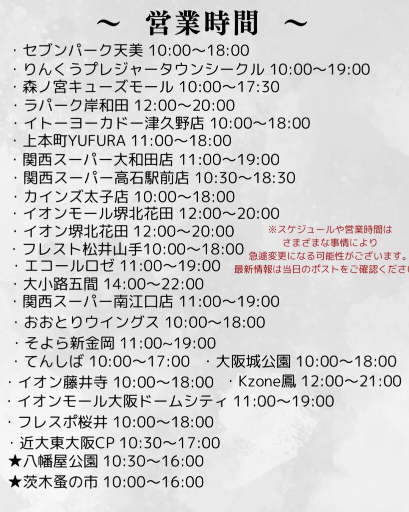 ※営業スケジュールや営業時間は天候や交通事情、在庫状況により変更になる可能性がございます。